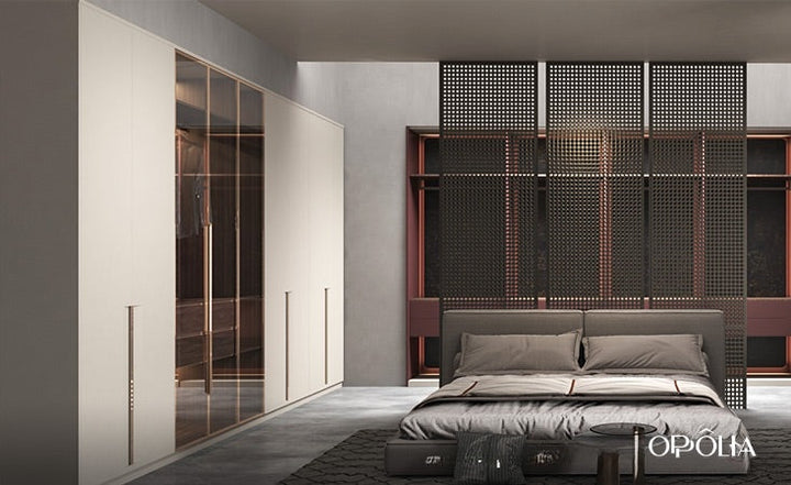 Fitted Light Grey and Red Walk in Wardrobe OBW22-L01