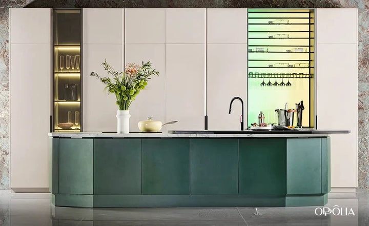 Stindee Series Contemporary White Kitchen Design with Green Island BLCC23070